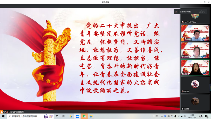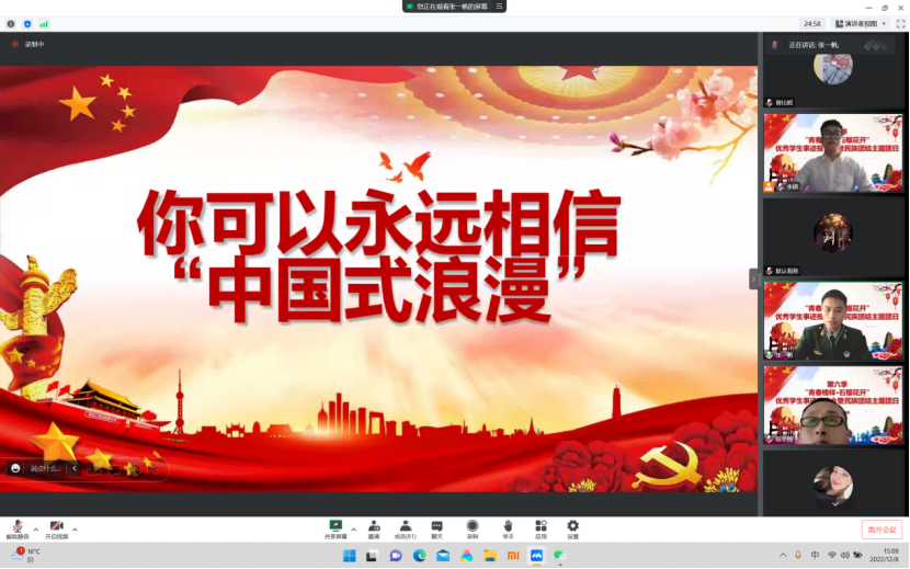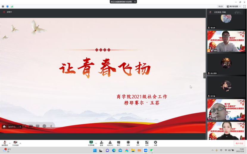 为深入学习贯彻党的二十大精神,引领青年学生铸牢中华民族共同体意识,凝聚青春奋进力量,12月5日——8日,由党委学生工作部、校团委主办的第六季“青春榜样·石榴花开”优秀学生事迹报告会以线上主题团日形式举行,校团委书记翟利强、派驻教师、辅导员,与来自商学院、医学院、国际学院的六个班级团支部共300余名师生参加报告会。