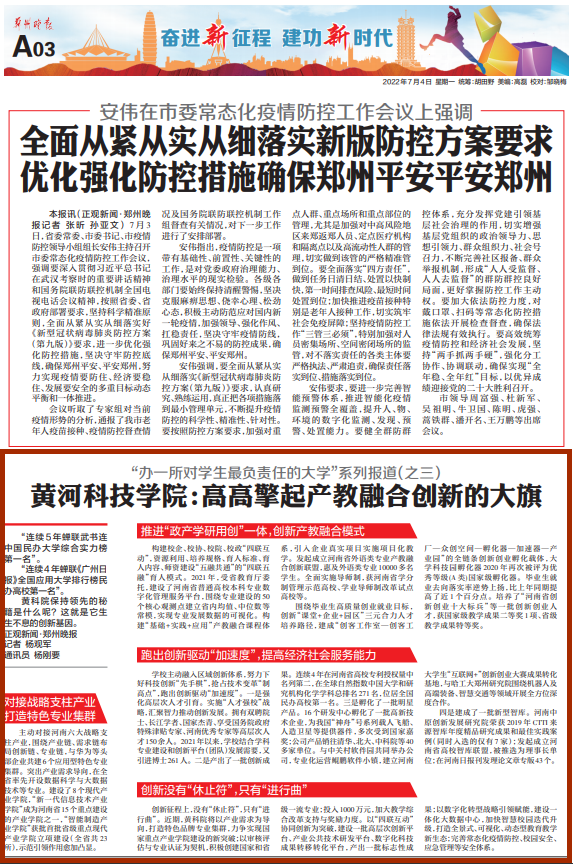 创新征程上,没有“休止符”,只有“进行曲”。近期,黄科院将以产业需求为导向,打造特色品牌专业集群,力争实现国家重点产业学院建设的新突破;以审核评估与专业认证为契机,积极创建国家和省级一流专业;投入1000万元,加大教学综合改革支持与奖励力度。以“四联互动”协同创新为突破,建设一批高层次创新平台、产业公共技术研发平台、数字化科技成果转移转化平台,产出一批标志性成果;以数字化转型战略引领赋能,建设一体化大数据中心,加快智慧校园迭代升级,打造全景式、可视化、动态型教育教学新生态;完善常态化疫情防控、校园安全、应急管理等安全体系。